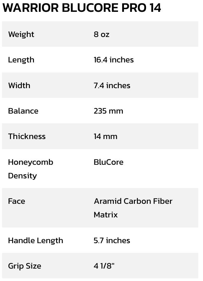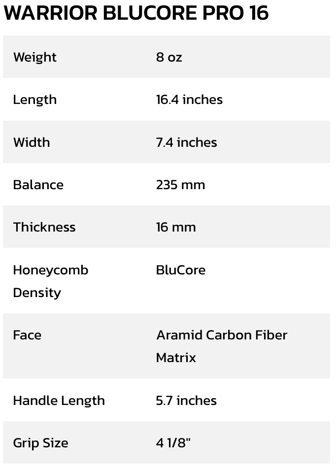 Introducing the Diadem Warrior BluCore Series. Built for players who demand more from their gear. Featuring revolutionary BluCore Technology, a solid EPP foam core that resists core crush and delamination, these paddles are designed for lasting performance. Available in nine models across three shapes and three thicknesses, the Warrior BluCore Series lets you choose your ideal blend of power, control, and versatility. Backed by a Lifetime Core Warranty, this paddle isn’t just durable, it’s a statement. This is Warrior BluCore. Built to last. Made to play.